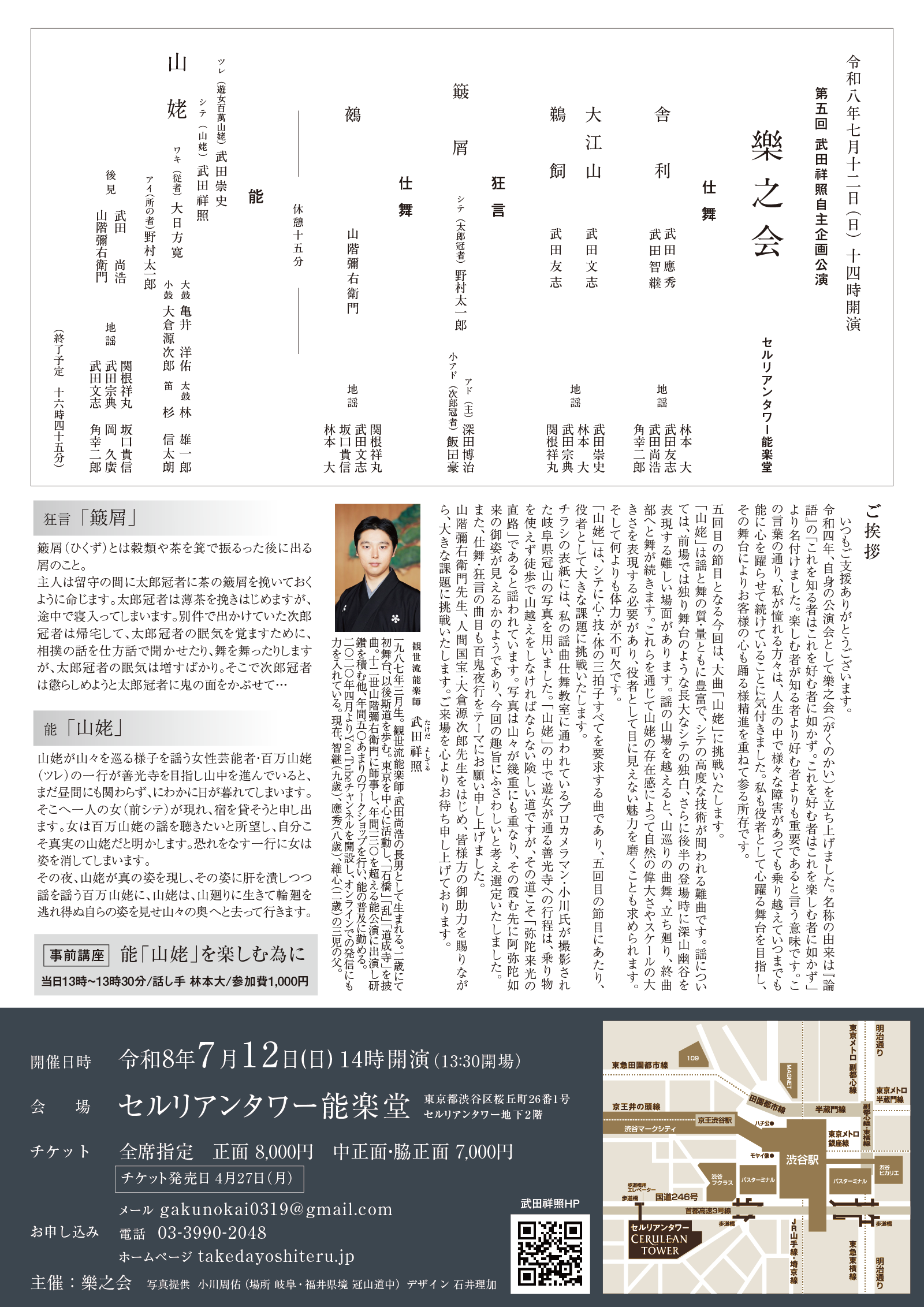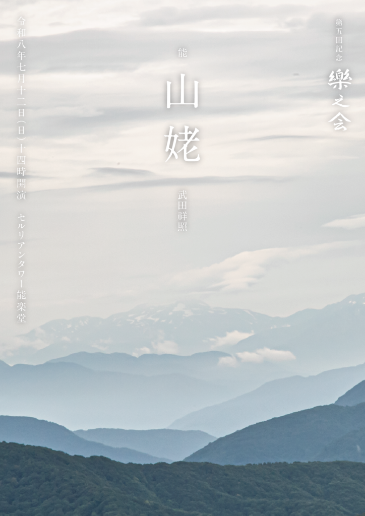 「山姥」は、シテに心・技・体の三拍子すべてを要求する曲であり、五回目の節目にあたり、役者として大きな課題に挑戦いたします。