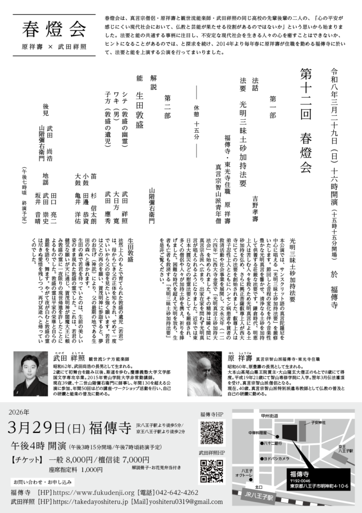 本公演では、サンスクリット語の真言陀羅尼を中心に唱える「光明三昧土砂加持法要」を厳修いたします。節回しと音程の変化を伴う音楽性豊かな光明真言を響かせ、清浄なる土砂を加持して供養する荘厳な法要です。鎌倉時代、明恵上人は苦しむ人々を救うため光明真言による土砂加持を弘め、さらに興正菩薩叡尊上人が西大寺にてこの法要を創始されました。叡尊上人は弟子忍性上人とともにハンセン病患者や貧者の救済活動や社会事業を展開し、文永元年(一二六四年)に西大寺金堂で「光明真言土砂加持大法会」を始められました。その精神は瞬く間に真言宗各派へ広まり、出家在家を問わず光明真言が唱えられるようになりました。近年では東日本大震災などの慰霊法要としても厳修され、多くの僧侶や人々が加持土砂を携え、祈りを捧げました。困難な時代を超えて光明を放ち、生者も亡者も救済する「光明三昧土砂加持法要」を是非ご覧ください。